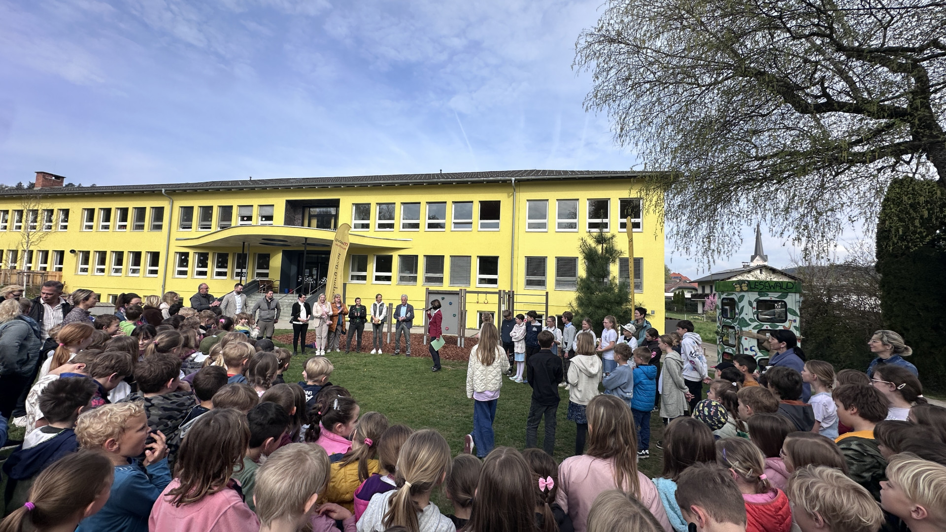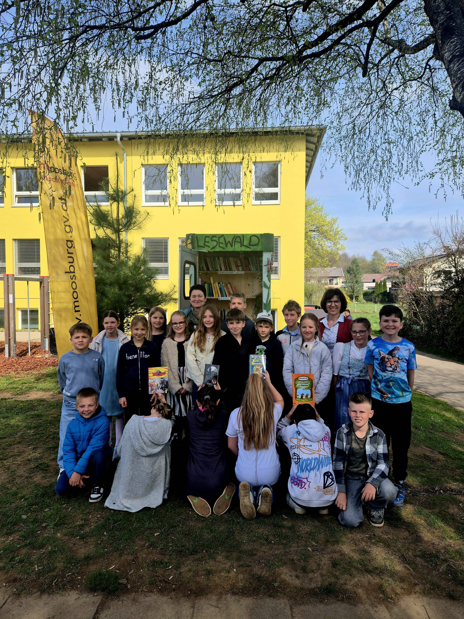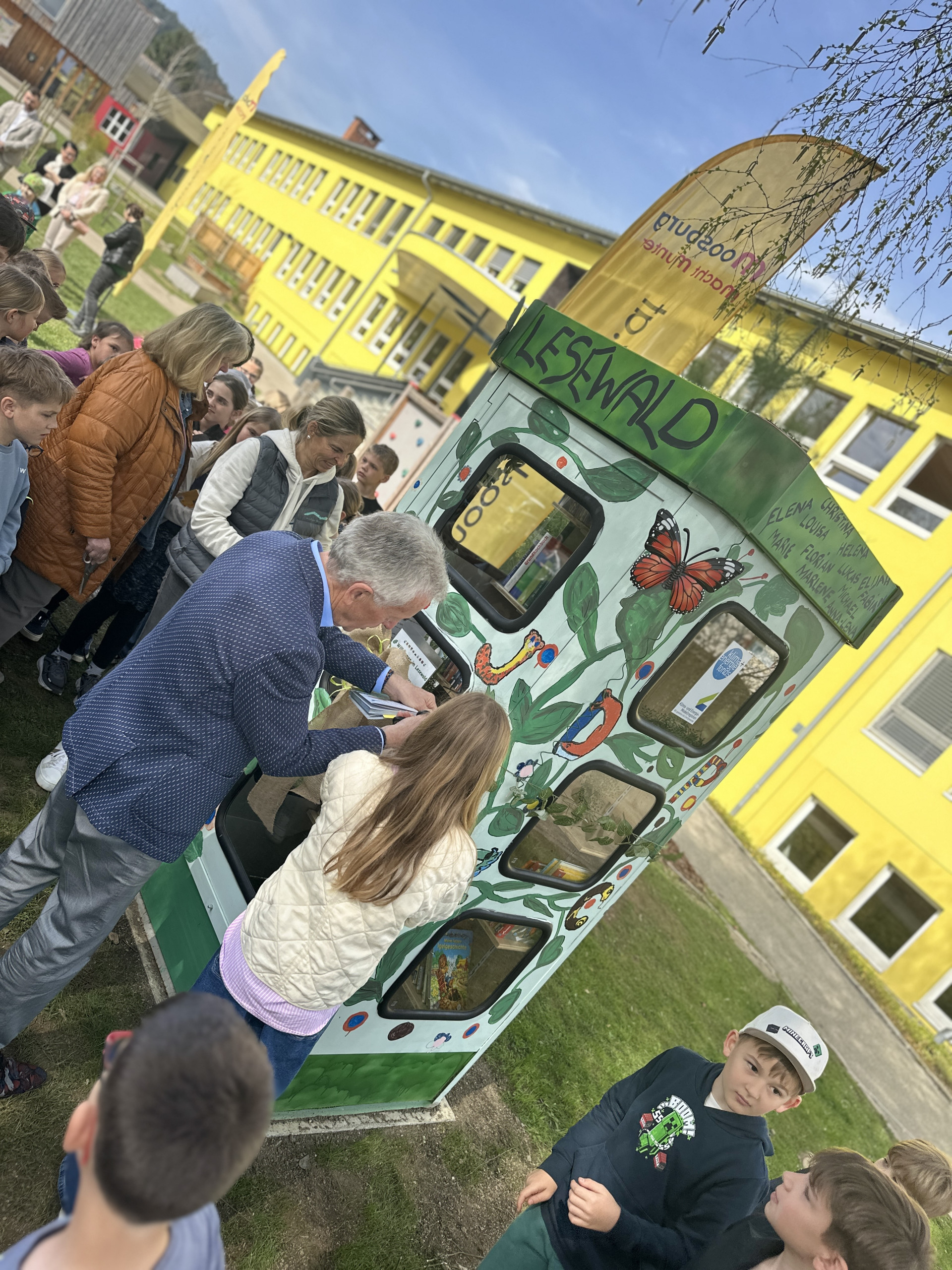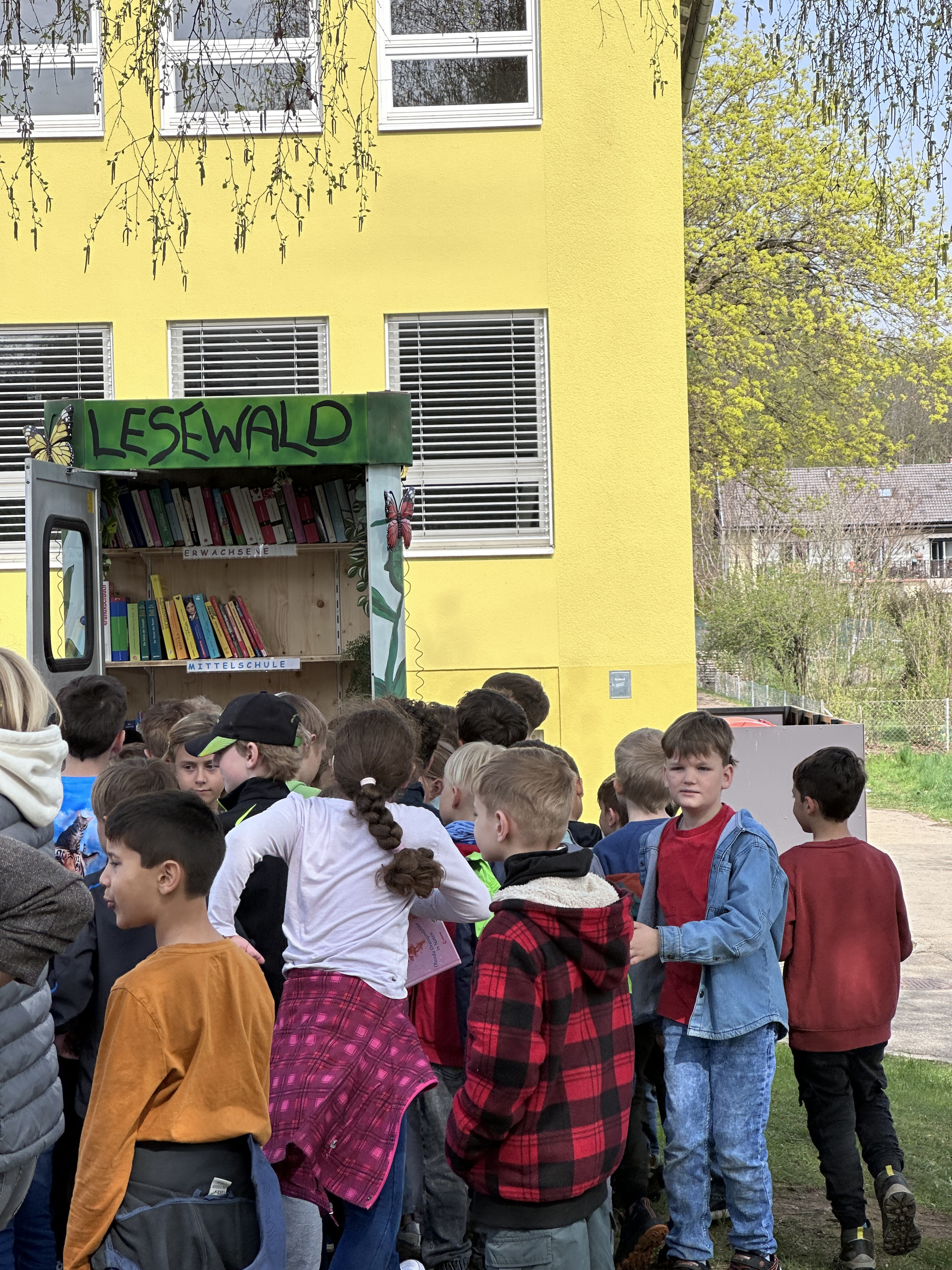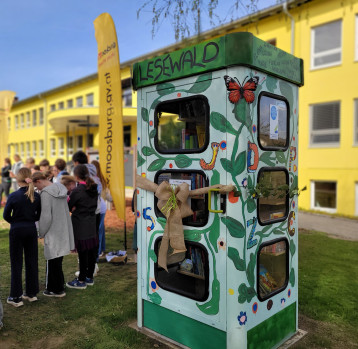 Jetzt steht er auf unserem Schulgelände: der neue „Lesewald“, ein Ort – eine Lesezelle – zum Tauschen, Lesen und Entdecken.