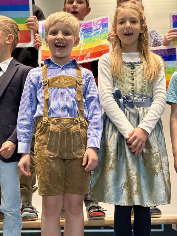 In der Mensa des Bildungscampus Moosburg findet die gemeinsame Schulfeier zum 26. Oktober statt. Die Mädchen und Buben aller Klasse haben Lieder, Gedichte, Tänze und ein kleines Theaterstück vorbereitet.