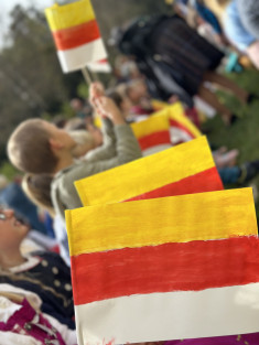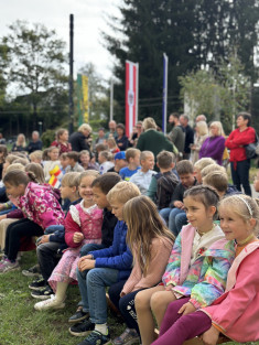 Die Mädchen, Buben und Lehrpersonen der VS Moosburg gestalteten eine Schulfeier zum 10.Oktober, an der auch Mamas und Papas, Omas und Opas, Betreuerinnen und Betreuer teilnahmen.
