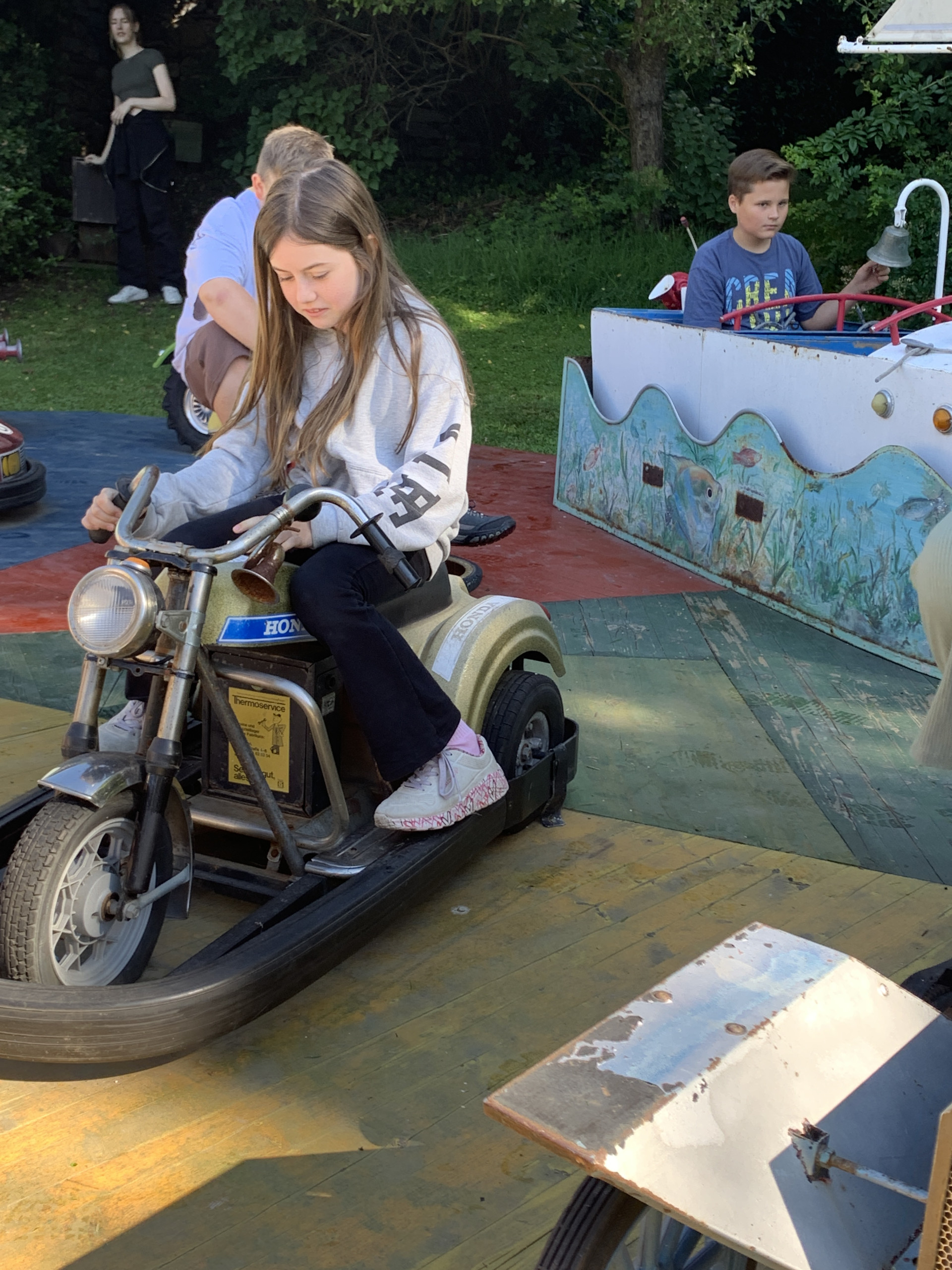Im KlangKunstGarten bestaunten die Kinder die verblüffenden Kunstwerke und erprobten das alte Karussell mit viel Freude.